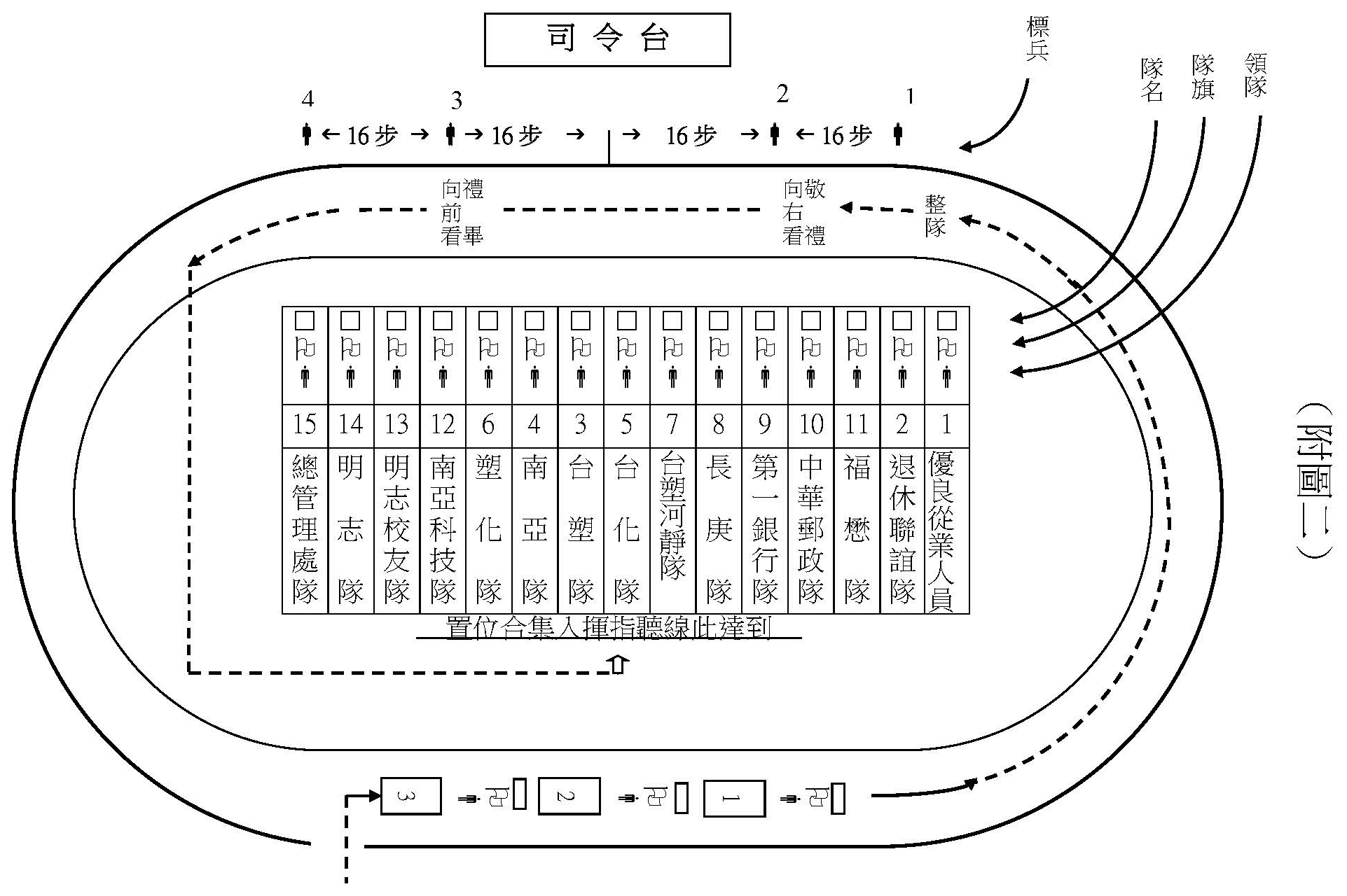 - 1.在音樂進行曲引導下前進,每一縱隊使用一個跑道(第一、八跑道不用),以右翼縱隊為基準,向右看齊向前對正。引導牌、隊旗、領隊於第四、五跑道間白線行進。