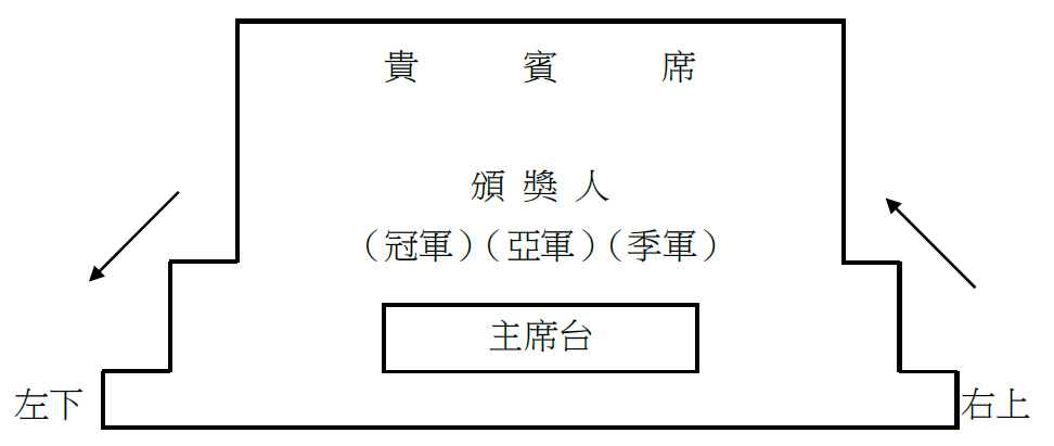 - 2.領獎代表自司令台右方上台(依序按冠、亞、季軍名次)領獎,左方下台入列(如下圖)。