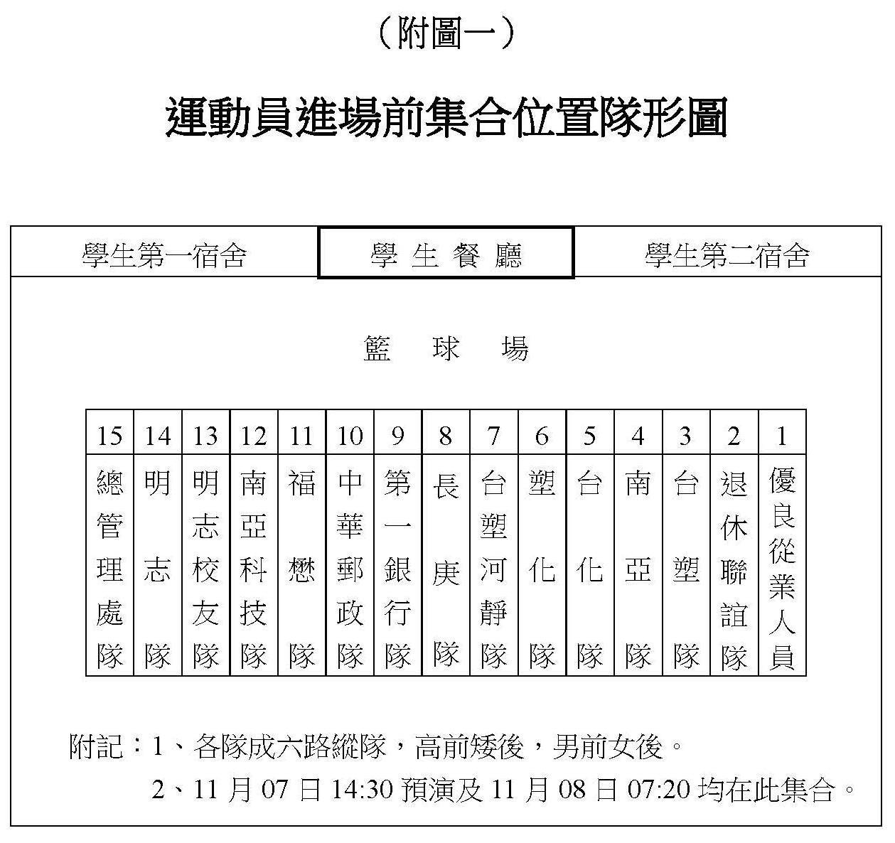 (一)各隊運動員請於11 月08 日07:20 分前在明志籃球場集合完畢,排列順序如下(隊形如附圖一p.17 頁)。
